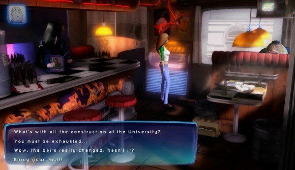Alicia manages to successfully straddle the line—most of the time—between being a relatively unique heroine by simply combining cliché adventure game smarm with Hollywood campus candour, insufferable confidence and inconsiderate hedonism; or an obnoxious Mary Sue slut (it’s a matter of perspective). But most of the other characters are bogged down in the awkward script; delivering their incongruous lines with an overcompensating enthusiasm.